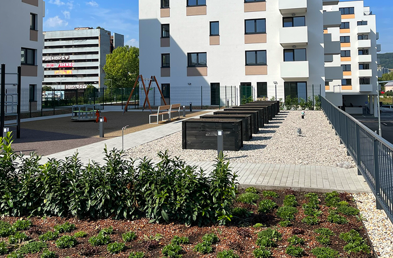 Kvalita života obyvateľov je navyše zlepšená vďaka bohatému množstvu kultivovanej zelene, ktorá sa rozprestiera po celej ploche parteru. Zelené priestory vo vnútroblokoch zvyšujú estetickú hodnotu priestoru a poskytujú ideálne prostredie pre rodiny a jednotlivcov túžiacich po aktívnom životnom štýle.