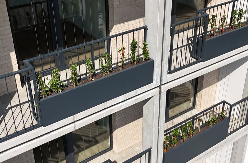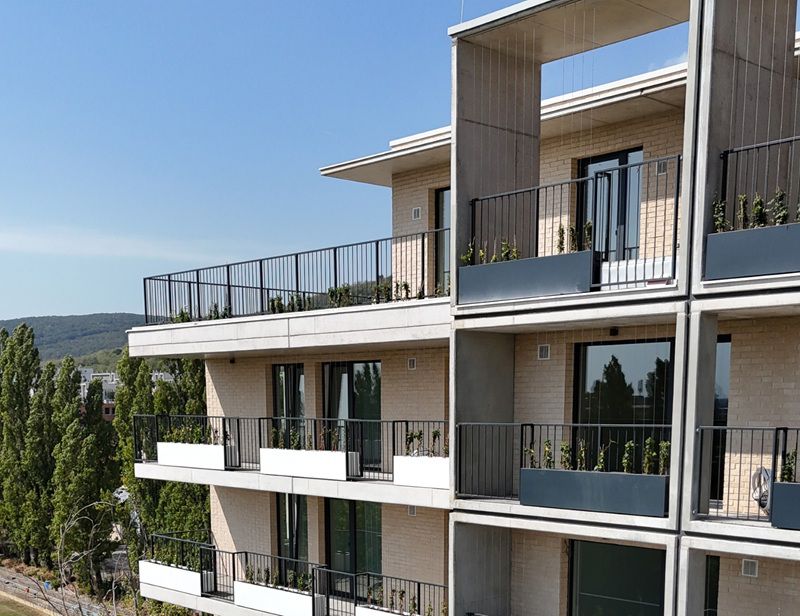 Každý byt disponuje terasou alebo predzáhradkou, ktorá umožňuje plynulé prepojenie interiéru s exteriérom. Na jednej strane projektu dominuje zelená fasáda s popínavou vegetáciou, zatiaľ čo na opačnej strane sú situované presklené loggie s posuvnými sklami. Tie ponúkajú flexibilné využitie priestoru – v lete ako otvorenú terasu, v zime ako útulnú zimnú záhradu.