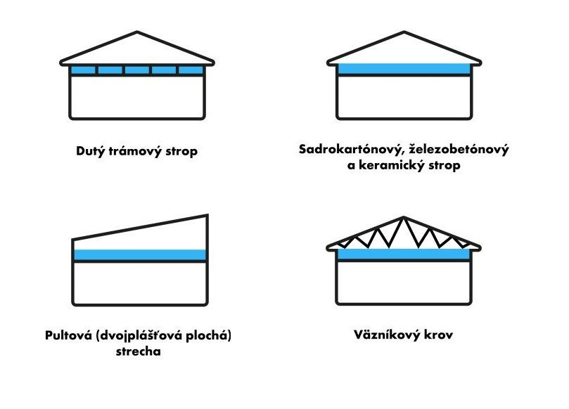 V starších domoch sú najčastejšie trámové, keramické a železobetónové stropy. Pre všetky tieto stropy, rovnako ako aj pre strechy s nízkym krovom – valbové a sedlové, je výbornou voľbou fúkaná minerálna izolácia. Veľmi efektívne sa dajú „nafúkať“ aj dvojplášťové ploché strechy, ktoré majú napríklad aj typické socialistické „kocky“. Tu však radšej odporúčame pre správny návrh skladby osloviť odborníka alebo projektanta. Sú to väčšinou miesta s náročným prístupom, no fúkaná izolácia sa dá jednoducho použiť všade tam, kde sa dá urobiť malý otvor na aplikáciu hadice na fúkanie.