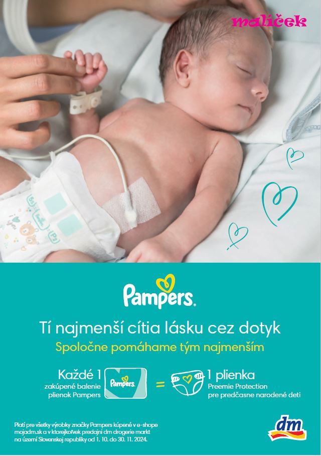 Podporiť predčasne narodené bábätká môžete teraz aj vy svojim nákupom akýchkoľvek plienok značky Pampers v e-shope mojadm.sk a v ktorejkoľvek predajni dm drogerie markt na území Slovenskej republiky od 1.10. do 30. 11. 2024. Každým nákupom pomôžete pokryť náklad na darovanie 1 plienočky Pampers Preemies Protection pre predčasniatka na Slovensku. Ďalšie informácie na Pampers.cz/preemies.