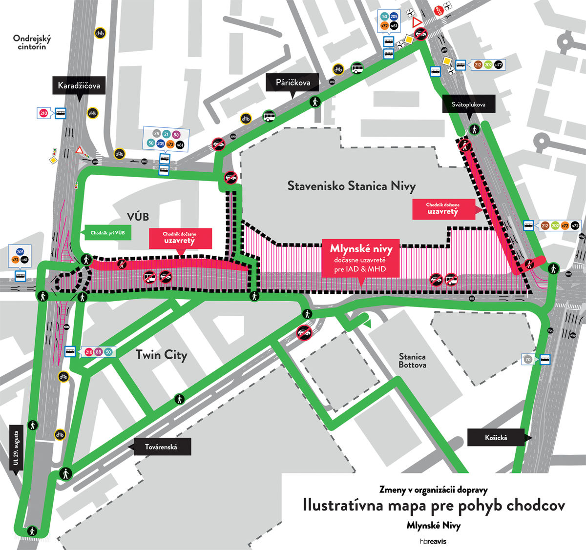 “V spolupráci s mestom a všetkými dotknutými stranami pristupujeme k uzávere úseku ulice Mlynské nivy medzi ulicami Karadžičova a Svätoplukova. V tejto časti, v rámci prvej etapy, bude ulica Mlynské nivy kompletne uzavretá pre automobilovú dopravu a MHD, trasy pre peších ostanú zachované. Alternatívne trasovanie MHD povedie cez Páričkovu ulicu, ktorá bude spojazdnená pre oba smery, náhradné parkovanie bude zabezpečené na naše náklady. Konkrétne obchádzkové trasy, ako aj mapu pre pohyb peších v celej zóne, verejnosť nájde aj na webe novenivy.sk, kde dlhodobo komunikujeme všetky nové informácie,” prezradila Martina Jamrichová, Country PR & Marketing Manager HB Reavis Slovakia.