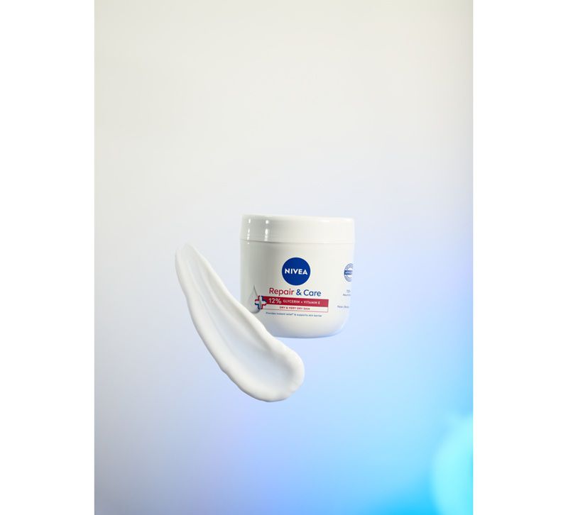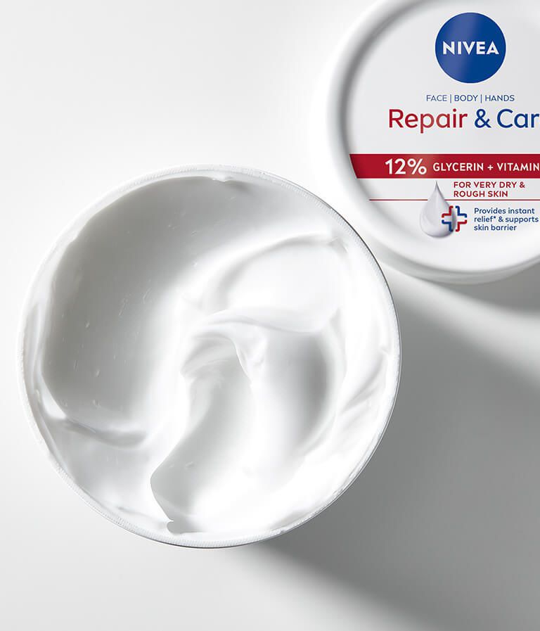 Intenzívne vyživujúce zloženie NIVEA krému Repair & Care je obohatené o 12 % glycerínu a vitamín E. Glycerín zvyšuje hydratáciu a podporuje zadržiavanie vlhkosti v pokožke, zatiaľ čo vitamín E má protizápalový účinok, ktorý je nevyhnutný pre podráždenú pokožku so sklonom k šupinateniu. Pokožka je hydratovaná až 72 hodín: šupinky sú zredukované, podráždená pokožka je okamžite upokojená a chránená pred ďalším vysušovaním.