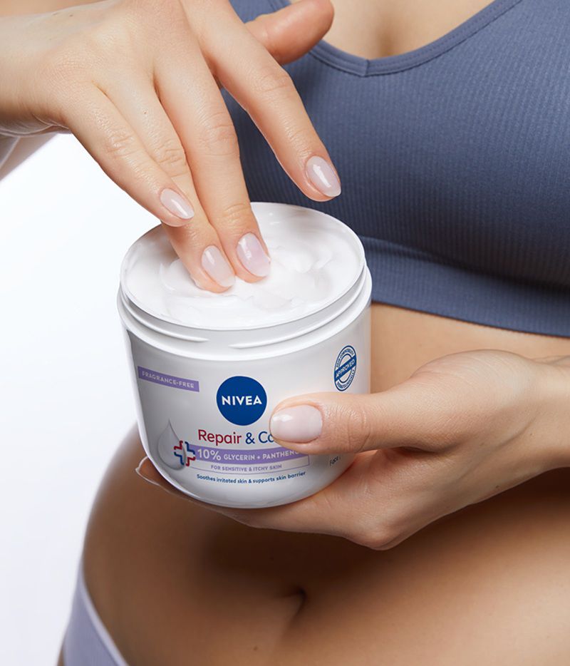 Jemné zloženie NIVEA krému Repair & Care pre citlivú pokožku obsahuje 10 % glycerínu, pantenol a je bez parfumácie. Upokojuje, regeneruje a intenzívne pokožku vyživuje. Je obzvlášť vhodný pre citlivú, podráždenú a svrbiacu pokožku. Doprajte si okamžitú úľavu nielen od svrbenia a dlhotrvajúcu hydratáciu až na 72 hodín.